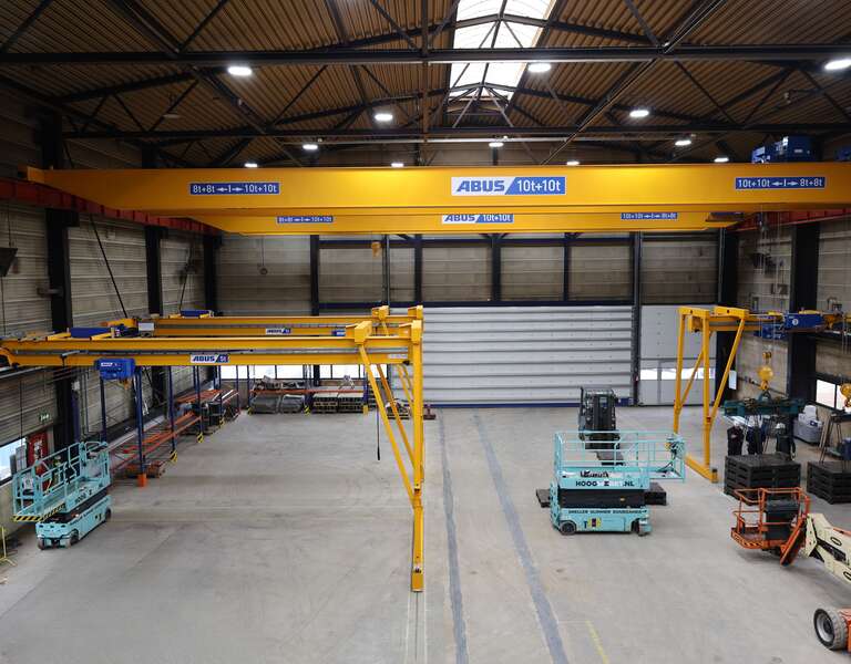 An industrial hall with several overhead travelling cranes on one track, with an ABUS service vehicle in the foreground.
