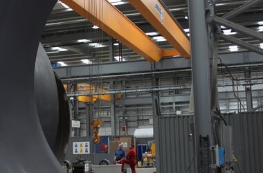 Cranes with bulb plate walkways along the main girders to ensure service on hoists Double-girder travelling cranes with lifting capacities of 20, 32, 40 and 63 t Outdoor overhead travelling crane lifting steel sheets Crane with weather protection roofs, drop latch as wind protection and wind measuring system Supporting the manufacture of the wind turbines and tubes with ABUS double-girder travelling cranes Cranes with spring cable reels providing power supply to lifting magnet crosshead  Cranes with lifting capacities of 63 t operate in tandem via radio remote control