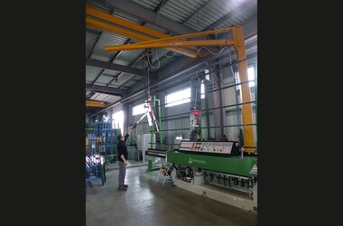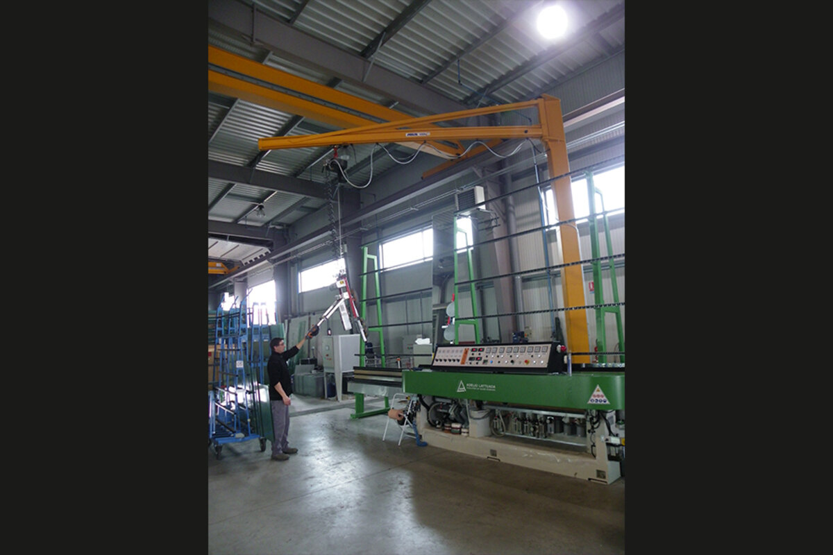 Miroiterie Righetti makes use of different kinds of ABUS cranes for the transport of their glass products and panes. They operate 3 single girder cranes of the ELK type with load capacities of 3.2 tonnes and spans of 19.6 metres. The ELK crane is one of the most commonly used cranes for small and medium load ranges. Favourable dimensions allow simultaneously for highest hook positions and minimal trolley approach dimensions. On the second level Miroiterie Righetti use a jib crane of the LS type and an HB system of the EHB-X type for their material flow. The pillar jib crane features a SWL of 400 kg and a jib arm length of 5 meters. A slewing radius of 270° makes it the ideal workplace crane in the lower load range when loads are to be moved effectively and precisely with the smooth-running jib arm. The HB system, too, is designed for the lower load range with a load capacity of 1 tonne. The loads are moved along a track length of 15 metres in the production bay. The crane type EHB-X is characterised by a particularly low installation height. The crane itself is stooled-up, i.e. it does not travel underneath the crane tracks but between the tracks which results in optimal use of the available room height.